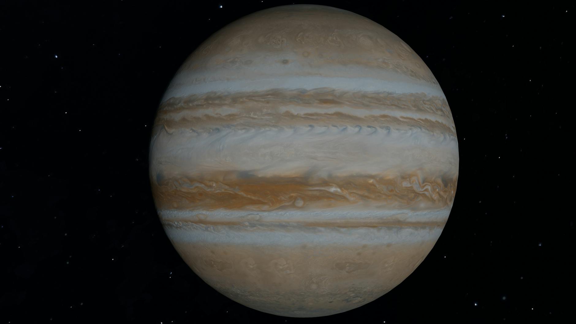 Zbliżenie Jowisza z Wielką Czerwoną Plamą i burzliwymi pasami chmur