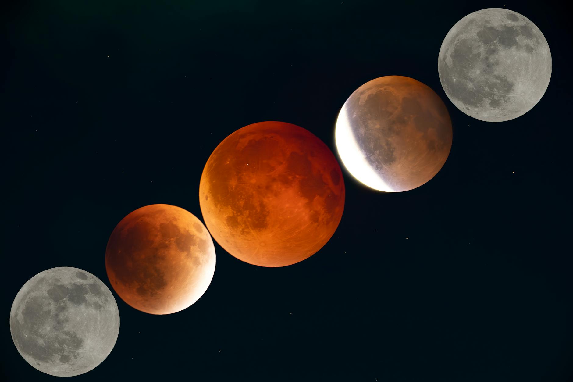 Kolejne fazy Księżyca podczas całkowitego zaćmienia na nocnym niebie